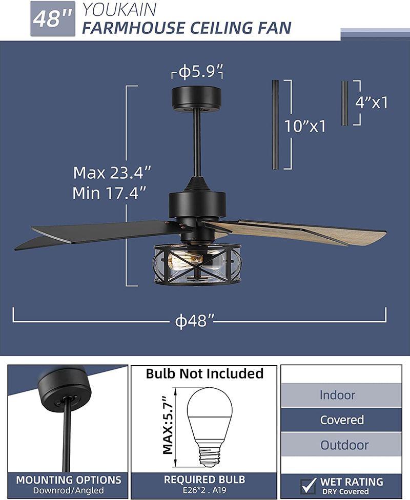 Dual Mount Compatible: Indoor/outdoor fan is height adjustable. This industrial ceiling fan can be hung by the standard downrod mount, 4" and 10" downrod included, or on sloped 20 degrees ceilings. (Vertical height MAX 23.38" (10" down rod)/ MIN 17.4" (4" down rod))
